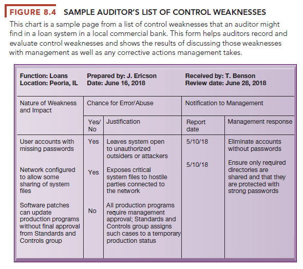 The audit lists and ranks all control weaknesses and estimates the probability of their occurrence. It then assesses the financial and organizational impact of each threat. Figure 8.4 is a sample auditor’s listing of control weaknesses for a loan system. It includes a section for notifying management of such weaknesses and for management’s response. Management is expected to devise a plan for countering significant weaknesses in controls.