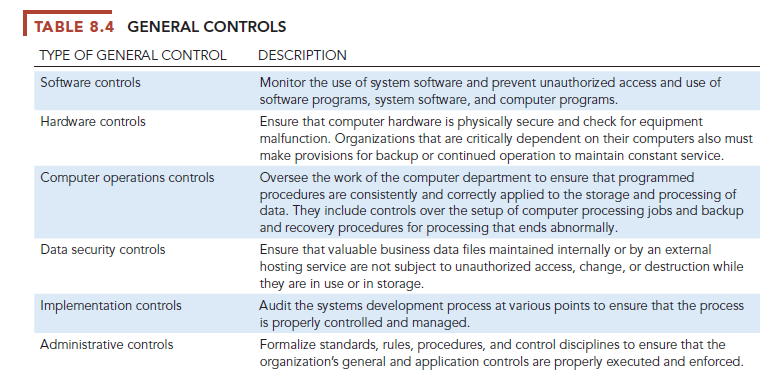 General controls include software controls, physical hardware controls, computer operations controls, data security controls, controls over the systems development process, and administrative controls. Table 8.4 describes the functions of each of these controls.