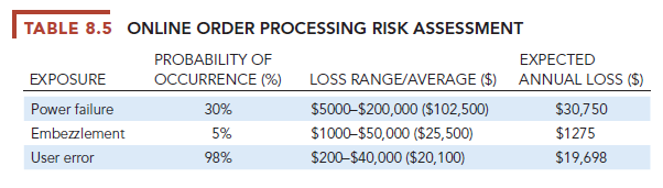 Table 8.5 illustrates sample results of a risk assessment for an online order processing system that processes 30,000 orders per day. The likelihood of each exposure occurring over a one-year period is expressed as a percentage. The next column shows the highest and lowest possible loss that could be expected each time the exposure occurred and an average loss calculated by adding the highest and lowest figures and dividing by two. The expected annual loss for each exposure can be determined by multiplying the average loss by its probability of occurrence.