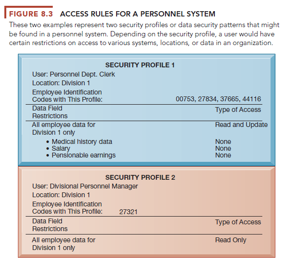 The access rules illustrated here are for two sets of users. One set of users consists of all employees who perform clerical functions, such as inputting employee data into the system. All individuals with this type of profile can update the system but can neither read nor update sensitive fields, such as salary, medical history, or earnings data. Another profile applies to a divisional manager, who cannot update the system but who can read all employee data fields for his or her division, including medical history and salary. We provide more detail about the technologies for user authentication later on in this chapter.