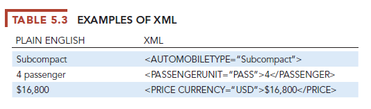 The foundation technology for web services is XML, which stands for Extensible Markup Language. This language was developed in 1996 by the World Wide Web Consortium (W3C, the international body that oversees the development of the web) as a more powerful and flexible markup language than hypertext markup language (HTML) for web pages. Whereas HTML is limited to describing how data should be presented in the form of web pages, XML can perform presentation, communication, and storage of data. In XML, a number is not simply a number; the XML tag specifies whether the number represents a price, a date, or a ZIP code. Table 5.3 illustrates some sample XML statements.