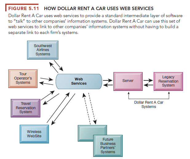 Other car rental companies have linked their information systems to airline companies’ websites before. But without web services, these connections had to be built one at a time. Web services provide a standard way for Dollar’s computers to “talk” to other companies’ information systems without having to build special links to each one. Dollar is now expanding its use of web services to link directly to the systems of a small tour operator and a large travel reservation system as well as a wireless website for cell phones and smartphones. It does not have to write new software code for each new partner’s information systems or each new wireless device (see Figure 5.11).