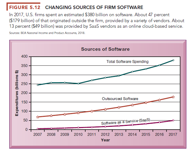 Today, many business firms continue to operate legacy systems that continue to meet a business need and that would be extremely costly to replace. But they will purchase or rent most of their new software applications from external sources. Figure 5.12 illustrates the rapid growth in external sources of software for U.S. firms.
