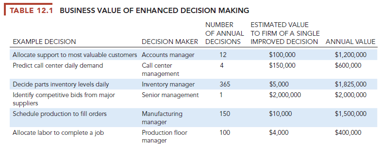 What does it mean to the business to make better decisions? What is the monetary value of improved decision making? Table 12.1 attempts to measure the monetary value of improved decision making for a small U.S. manufacturing firm with $280 million in annual revenue and 140 employees. The firm has identified a number of key decisions where new system investments might improve the quality of decision making. The table provides selected estimates of annual value (in the form of cost savings or increased revenue) from improved decision making in selected areas of the business.