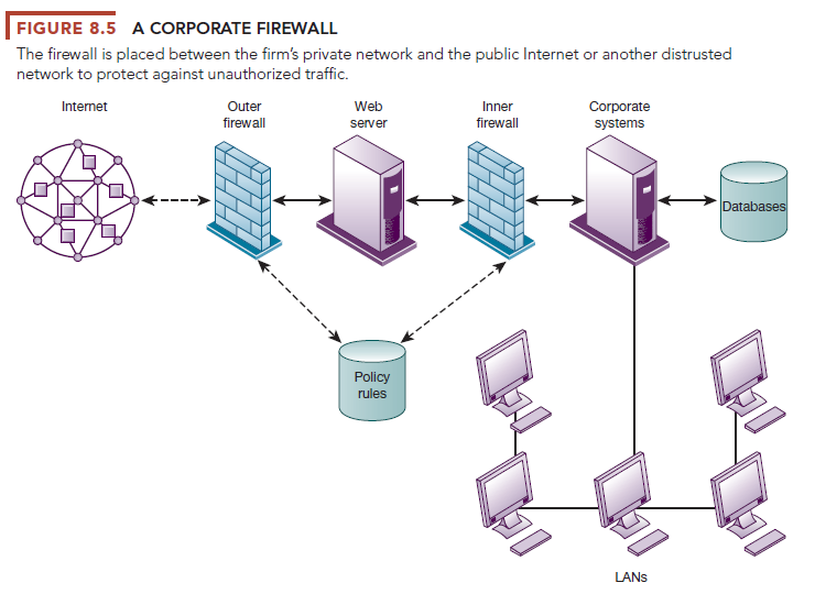 Firewalls prevent unauthorized users from accessing private networks. A firewall is a combination of hardware and software that controls the flow of incoming and outgoing network traffic. It is generally placed between the organization’s private internal networks and distrusted external networks, such as the Internet, although firewalls can also be used to protect one part of a company’s network from the rest of the network (see Figure 8.5).