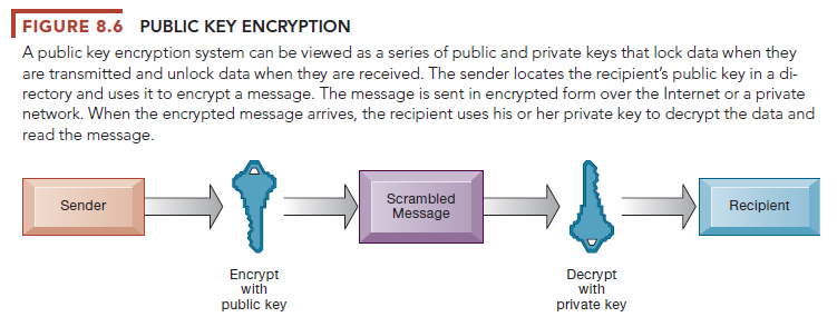 The problem with all symmetric encryption schemes is that the key itself must be shared somehow among the senders and receivers, which exposes the key to outsiders who might just be able to intercept and decrypt the key. A more secure form of encryption called public key encryption uses two keys: one shared (or public) and one totally private as shown in Figure 8.6. The keys are mathematically related so that data encrypted with one key can be decrypted using only the other key. To send and receive messages, communicators first create separate pairs of private and public keys. The public key is kept in a directory, and the private key must be kept secret. The sender encrypts a message with the recipient’s public key. On receiving the message, the recipient uses his or her private key to decrypt it.