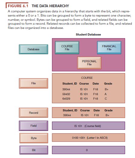 A computer system organizes data in a hierarchy that starts with bits and bytes and progresses to fields, records, files, and databases (see Figure 6.1). A bit represents the smallest unit of data a computer can handle. A group of bits, called a byte, represents a single character, which can be a letter, a number, or another symbol. A grouping of characters into a word, a group of words, or a complete number (such as a person’s name or age) is called a field. A group of related fields, such as the student’s name, the course taken, the date, and the grade, comprises a record; a group of records of the same type is called a file.