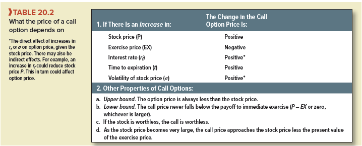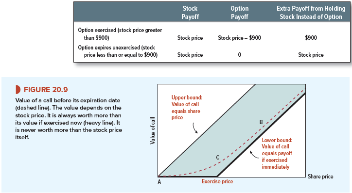 The diagonal line in Figure 20.9 is the upper bound to the option price. Why? Because the option cannot give a higher ultimate payoff than the stock. If at the option’s expiration the stock price ends up above the exercise price, the option is worth the stock price less the exercise price. If the stock price ends up below the exercise price, the option is worthless, but the stock’s owner still has a valuable security. For example, if the option’s exercise price is $900, then the extra dollar returns realized by stockholders are shown in the following table: