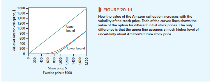 Figure 20.11 shows how volatility affects the value of an option. The upper curved line depicts the value of the Amazon call option assuming that Amazon’s stock price, like that of stock Y, is highly variable. The lower curved line assumes a lower (and more realistic) degree of volatility.[3]