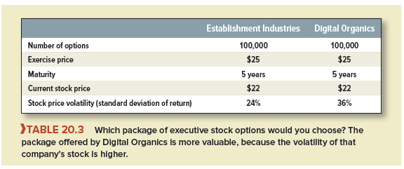 Suppose you have to choose between two job offers, as CFO of either Establishment Industries or Digital Organics. Establishment Industries’ compensation package includes a grant of the stock options described on the left side of Table 20.3. You demand a similar package from Digital Organics, and they comply. In fact, they match the Establishment Industries options in every respect, as you can see on the right side of Table 20.3. (The two companies’ current stock prices just happen to be the same.) The only difference is that Digital Organics’ stock is 50% more volatile than Establishment Industries’ stock (36% annual standard deviation versus 24% for Establishment Industries).