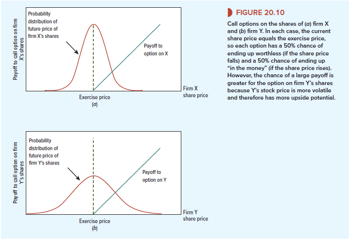 Of course, in practice future stock prices may take on a range of different values. We have recognized this in Figure 20.10, where the uncertain outlook for Y’s stock price shows up in the wider probability distribution of future prices.[2] The greater spread of outcomes for stock Y again provides more upside potential and, therefore, increases the chance of a large payoff on the option.