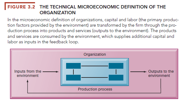 An organization is a stable, formal social structure that takes resources from the environment and processes them to produce outputs. This technical definition focuses on three elements of an organization. Capital and labor are primary production factors provided by the environment. The organization (the firm) transforms these inputs into products and services in a production function. The products and services are consumed by environments in return for supply inputs (see Figure 3.2).