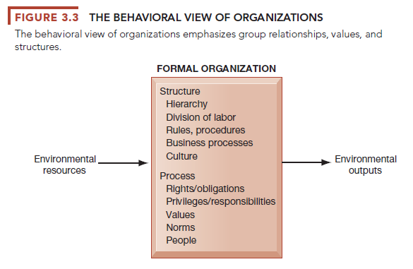 In this behavioral view of the firm, people who work in organizations develop customary ways of working; they gain attachments to existing relationships; and they make arrangements with subordinates and superiors about how work will be done, the amount of work that will be done, and under what conditions work will be done. Most of these arrangements and feelings are not discussed in any formal rulebook.