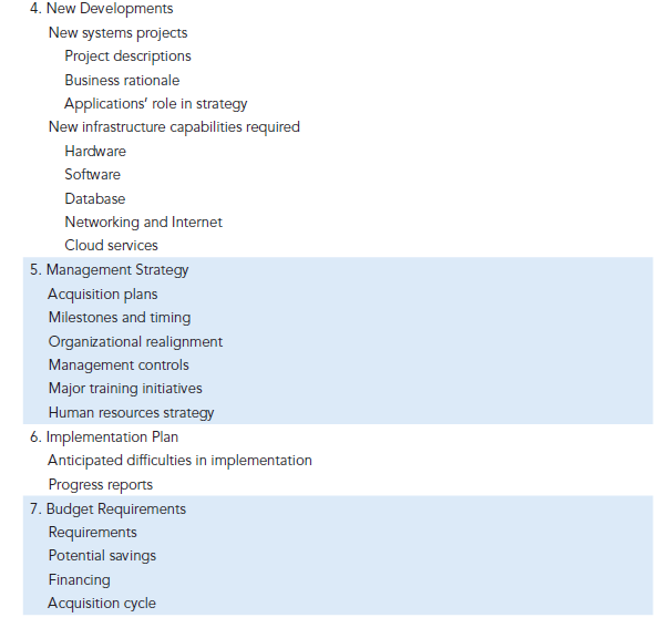 The plan contains a statement of corporate goals and specifies how information technology will support the attainment of those goals. The report shows how general goals will be achieved by specific systems projects. It identifies specific target dates and milestones that can be used later to evaluate the plan’s progress in terms of how many objectives were actually attained in the time frame specified in the plan. The plan indicates the key management decisions, technology, and required organizational change.