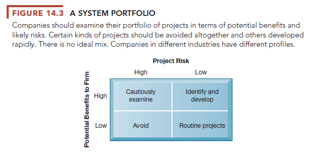 Once strategic analyses have determined the overall direction of systems development, portfolio analysis can be used to evaluate alternative systems projects. Portfolio analysis inventories all of the organization’s information systems projects and assets, including infrastructure, outsourcing contracts, and licenses. This portfolio of information systems investments can be described as having a certain profile of risk and benefit to the firm (see Figure 14.3) similar to a financial portfolio.