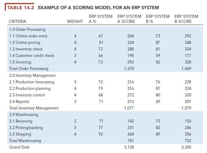 A scoring model is useful for selecting projects where many criteria must be considered. It assigns weights to various features of a system and then calculates the weighted totals. Using Table 14.2, the firm must decide among two alternative enterprise resource planning (ERP) systems. The first column lists the criteria that decision makers will use to evaluate the systems. These criteria are usually the result of lengthy discussions among the decision-making group. Often the most important outcome of a scoring model is not the score but agreement on the criteria used to judge a system.
