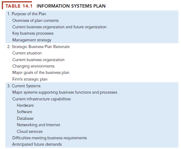 In order to identify the information systems projects that will deliver the most business value, organizations need to develop an information systems plan that supports their overall business plan and in which strategic systems are incorporated into top-level planning. The plan serves as a road map indicating the direction of systems development (the purpose of the plan), the rationale, the state of current systems, new developments to consider, the management strategy, the implementation plan, and the budget (see Table 14.1).