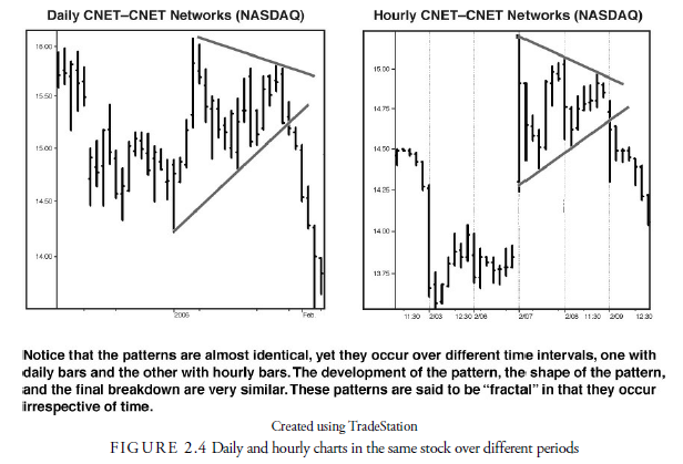 Fifth, technical analysts also believe that, like trend lines, these patterns are fractal (see Figure 2.4). Each investor or trader has a specific period of interest in which she operates. Interestingly, regardless of period, patterns occur with similar, although not identical, shapes and characteristics. Thus, an analyst who is watching five-minute bar charts will observe the same patterns that an analyst watching monthly bar charts will see. These patterns suggest that the behavior that produces them is dependent also on the participants’ period of interest. A pattern in a five-minute bar chart, for example, is the result of other traders with a five-minute bar chart time horizon. Monthly investors would have very little effect on the five-minute bar chart, as five-minute traders would have almost no effect on the monthly bar chart. Thus, each group of participants, as defined by their investment horizon, has its own world of patterns that might or might not affect each other but will be similar in shape. Pattern analysis is, therefore, universal and independent of time.