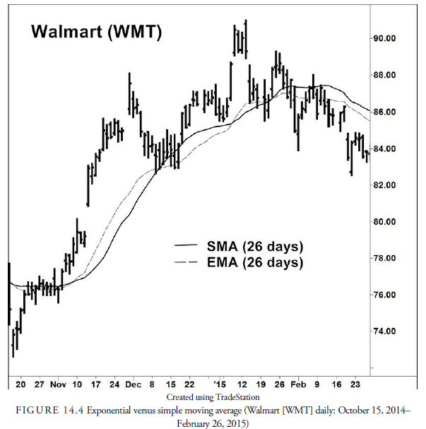Figure 14.4 shows both a 26-day SMA and a 26-day EMA for WMT. Generally, the EMA will change direction more quickly because of the additional weighting that is placed on the most recent data. However, these two curves will usually track each other closely.
