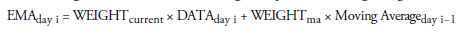 Once we have the weights, the formula for calculating the exponential moving average is as follows: