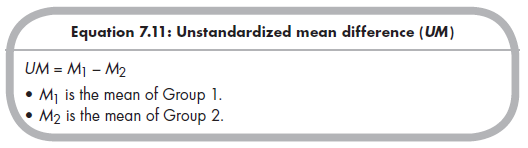 You probably recognize this equation from Chapter 5, where we discussed the various standardized mean differences (Equations 5.5 to 5.7). In Equation 7.11, however, there is no denominator involving some variant of the standard deviation. This standard deviation denominator of Equations 5.5 to 5.7 served to standardize the mean differences in terms of standard deviation units. Here, where the metric is meaningful, you do not wish to standardize this mean difference, but instead leave it in its unstandardized, or raw score, metric.