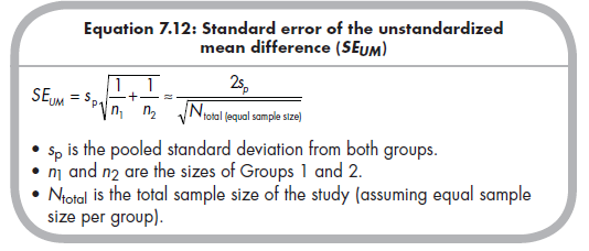 To estimate the standard error of this unstandardized mean difference (for weighting in your meta-analysis; see Chapter 8), you use the following equation (see Bond, Wiitala, & Richard, 2003; Lipsey & Wilson, 2001, p. 47):