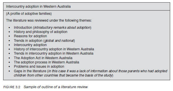 While reading the literature for theoretical background of your study, you will realise that certain themes have emerged. List the main ones, converting them into subheadings. Some people write up the entire literature review in one section, entitled ‘Review of the literature’, ‘Summary of literature’ or ‘The literature review’, without subheadings, but the author strongly suggests that you write your literature review under subheadings based upon the main themes that you have discovered and which form the basis of your theoretical framework. These subheadings should be precise, descriptive of the theme in question and follow a logical progression. Now, under each subheading, record the main findings with respect to the theme in question (thematic writing), highlighting the reasons for and against an argument if they exist, and identifying gaps and issues. Figure 3.2 shows the subheadings used to describe the themes in a literature review conducted by the author for a study entitled ‘Intercountry adoption in Western Australia’.